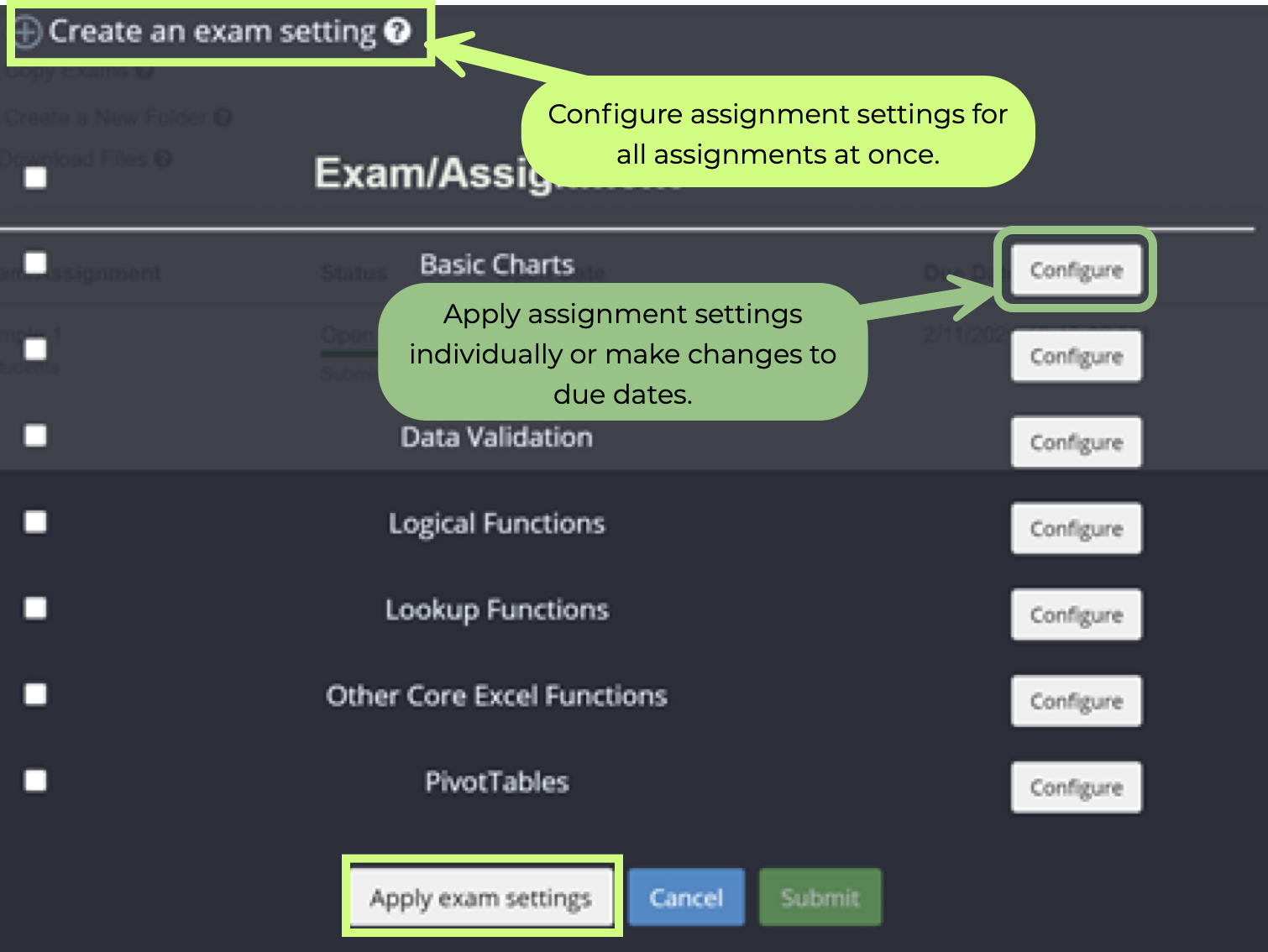 - Once all the exam/assignment configuration buttons are blue, select Submit to create your assignments